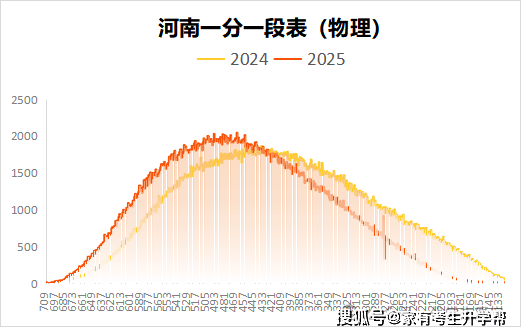 上图是河南省物理类2024和2025年的一分一段表同分人数对比阐发图,从图中能够看出,同分人数分布趋向大致不异,取2024年比拟,2025波峰前移,正在部门分数段人数分布稍微有点差距。