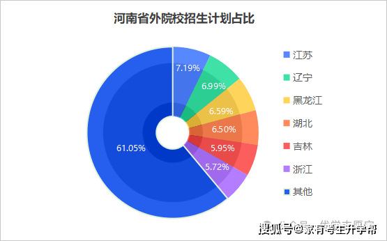下图为除河南省外各省份正在河南省招生打算占比,排行前3的别离是江苏(占7。19%)、辽宁(占6。99%)和(占6。59%)。此中,江苏省有9002个招生打算,有8750招生打算,省有8254个招生打算。江苏高校数量较多,能赐与河南较多招生打算,也反映了其教育资本对外的辐射能力。辽宁和招生打算均跨越8000人。高校招生打算的添加可能是由于河南做为高考大省,是高校进行宣传和招生的主要区域。添加正在河南的登科人数,有益于高校吸引更多优良的河南学子报考,提拔学校的生源质量。