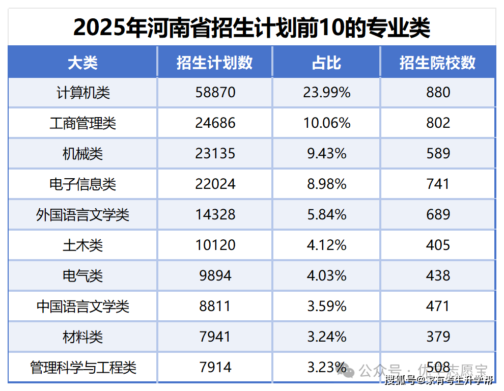 下表为河南招生打算前10的专业类,能够看出,工学学科门类占领半壁山河,十席中占五席,脚以申明国度和各高校对工科的注沉,当然,这也和工学大类下专业数量最多相关,良多耳熟能详的专业都属于工学学科门类,好比计较机,从动化,机械制制及其从动化、软件工程、电子消息等。