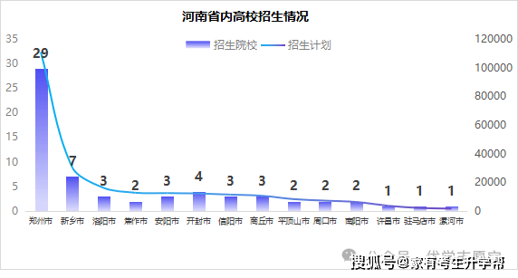 上表为河南省内各市高校招生打算数,郑州市因其院校数量最多使其招生打算遥遥领先,其做为省会城市,正在高档教育资本方面拥有显著劣势,有29所院校,110269个招生打算,占省内打算的44。94%,几乎占领半壁山河。紧随其后的是新乡市7所院校30221个招生打算,占省内打算的12。32%;洛阳市3所院校16022招生打算,占省内打算的6。53%。
