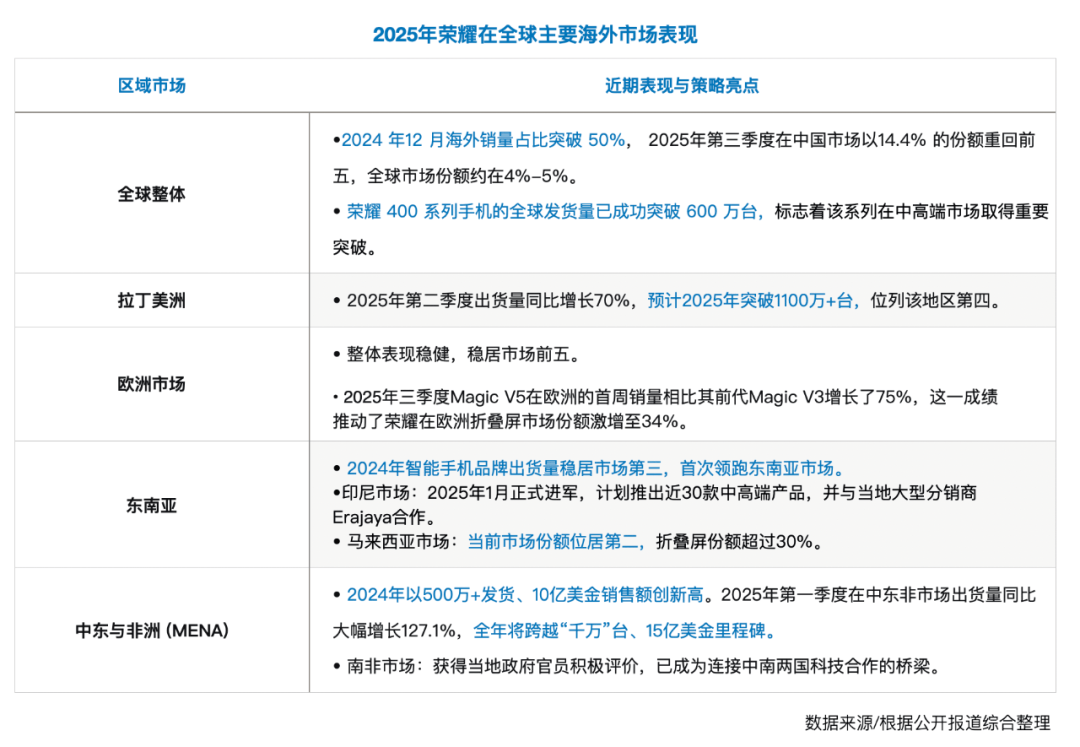 仅正在中国成功,荣耀远远不敷。只要正在全球支流市场取苹果、三星同台竞技并坐稳脚跟,才能实正完成品牌的礼,成立起全球性的品牌画像,从而反哺其正在中国市场的高端抽象。“荣耀正正在向全球领先的AI终端生态公司转型,做为一家营业遍及全球的企业,品牌全球化是必修课。”荣耀公司高级副总裁、品牌营销总裁兼集团首席营销官郭锐称。过去五年荣耀品牌全球化历程中,郭锐承担了同一办理的全球品牌营销系统的使命,该系统下辖公司品牌计谋、公关、机关营销(担任人对外称 “全球 CMO”)等本能机能部分,及中国、西欧、东北欧、东南亚、南太、中东非、拉美、欧亚等全球八大区域营销部(担任人对外称该区域 “CMO”)。场景尝试室创始人吴声认为,荣耀全球品牌营销系统的扶植正在当下有其特殊意义。缘由正在于,品牌来自对消费者的理解以及对场景的定义,而场景的实现来自研发实力。营销、产物和研发素质上是一个闭环:理解消费者才能创制准确场景——有场景才有内容有相关的品牌推给消费者——有研发实力才能将融入现实产物——产物加强品牌抽象。正在全球高端品牌阵地的西欧,荣耀高端旗舰通过V2、V3、V5获得市场承认,并正在2024年实现377%增加和30%+的市场份额;正在印尼,荣耀取本地巨头Erajaya合做成立本土化供应链;正在欧洲,它取宝马、梅赛德斯配合摸索智能车联的新范式;正在拉美,70%的市场增速验证着其区域深耕策略的无效性。通过品牌高端化、当地化策略、渠道化扶植及产物立异,每个市场都如统一个的培育皿,培育着不异AI内核下的差同化生态处理方案。
